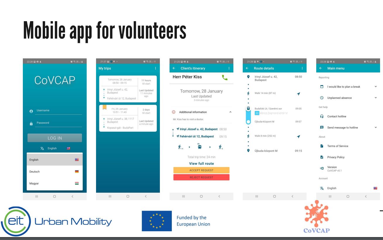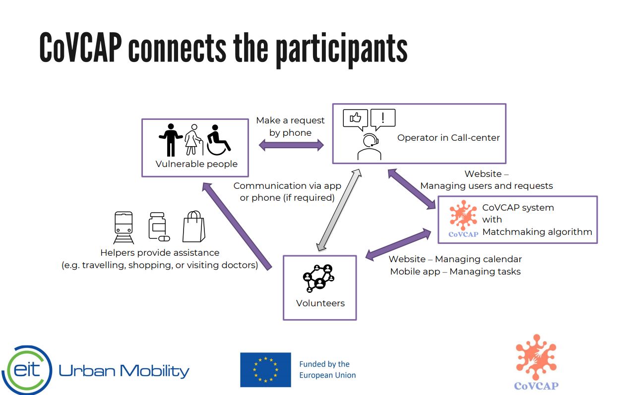 S podporou systému môžu zamestnanci a dobrovoľníci zo sociálnych a charitatívnych organizácií pomáhať starším ľuďom a ľuďom so zníženou pohyblivosťou riešiť ich každodenné problémy. Môžu ich sprevádzať na lekárske prehliadky, pomáhať pri nákupe základných vecí (potraviny, lieky), či dokonca poskytovať podporu duševného zdravia. K tomu všetkému IT systém CoVCAP podporuje pomocníkov so širokou databázou vo svojom IT systéme, ako je napríklad plánovanie trasy pre uľahčenie využívania verejnej dopravy pomocou systému BKK Courier. K službám IT systému CoVCAP môžu po registrácii pristupovať ako tí, ktorí potrebujú pomoc, tak aj dobrovoľníci. Oprávnenosť prvého možno overiť s pomocou obce, oprávnenosť druhého zabezpečiť krátkym školením a samozrejme uzatvorením poistenia zodpovednosti za škodu.