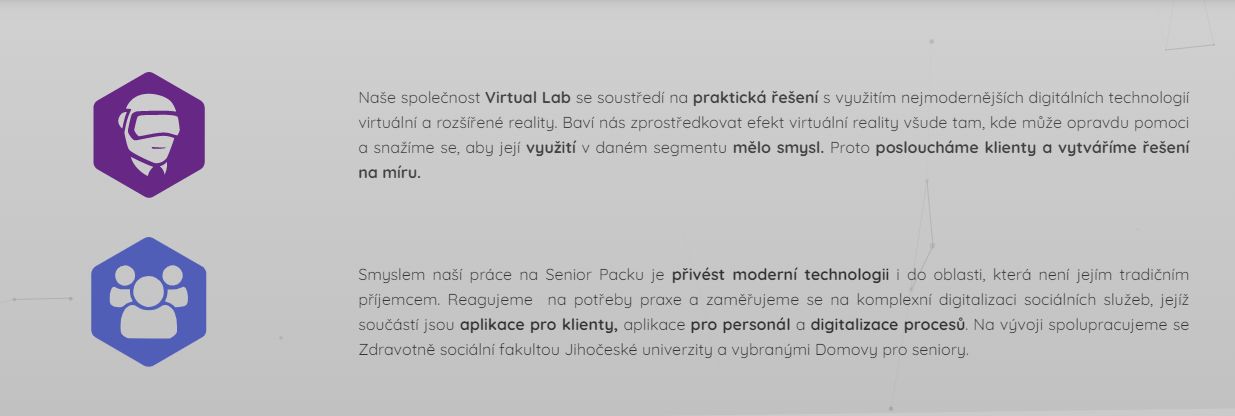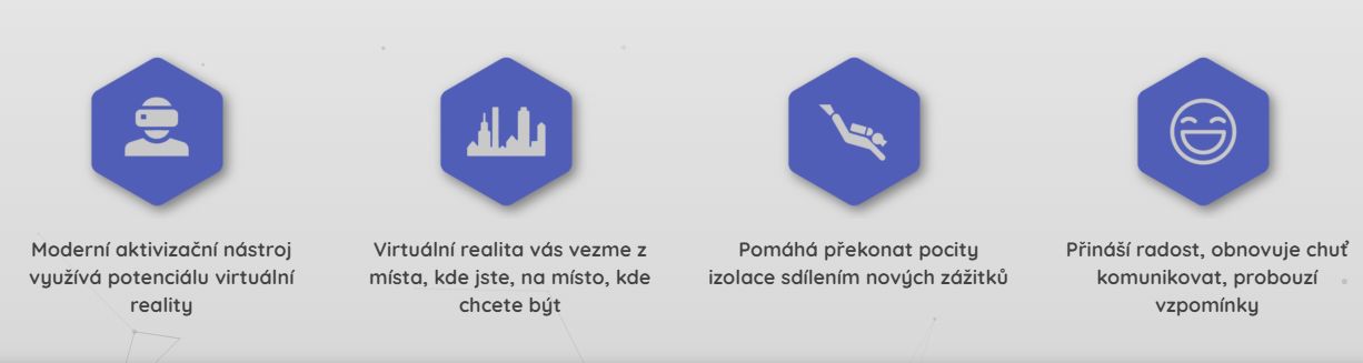 V pokročilom veku mnohí seniori čelia vážnej izolácii v dôsledku zhoršujúcej sa fyzickej kondície stav, ktorý niekedy znamená veľmi zníženú pohyblivosť. Izolácia spôsobená nehybnosťou vedie k životu ťažkého stereotypu a nedostatku aktivity a podnetov. Virtuálna realita je a technológia, ktorá môže poskytnúť náhradné životné prostredie a situácie tým, ktorí už ich nemôžu zažiť v realite. VR Senior Pack je súbor aplikácií virtuálnej reality sprostredkúvajúci rôzne prostredia a aktivity ako cestovanie po celom svete, pozorovanie života na farme, účasť na tanečnom stretnutí a mnohé iné. Využitie virtuálnej reality v starostlivosti o seniorov je osvedčené komu: